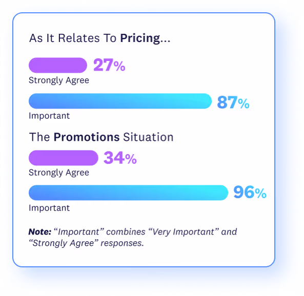 To compound issues further, this trend of high value/low ability extends to their ability to offer effective promotions to increasingly demanding shoppers. An even larger majority of retailers, 96 percent, indicate that promotion optimization is important (62 percent say “very important”). However, just 34 percent strongly agree that they have an effective promotion solution in place.